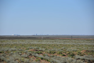 Die Straße führt beim russischen Weltraumbahnhof Baikonur vorbei, welches am nördlichen Horizont noch zu erkennen ist.