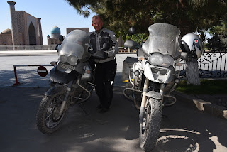 Dieses muss mit Dollar bezahlt werden, für´s Essen haben wir aber zu wenig usbekische Som. Einer der beiden jungen Hotelangestellten fährt mit Manfred hinten auf der BMW zu einem kleinen Laden, wo ein Geldwechsler einen wesentlich höheren Wechselkurs anbietet als es der offizielle ist.
