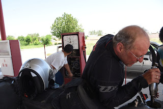 Vor der Stadtausfahrt Dushanbe fanden wir noch eine Tankstelle mit 95er Benzin. Wir wussten von Motorradreisenden, dass das größte Problem in Usbekistan das Auftreiben von Sprit sein wird. Also wurden die Höcker unserer Kamele nochmals mit gutem Benzin gefüllt.