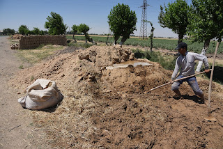 Sehr oft findet man entlang der Straße Lehmziegel angeboten. Hier ein Ein-Mann-Betrieb. Lehmige Erde neben der Straße wird mit Stroh und Wasser aus dem daneben fließenden Kanal abgemischt, in einem Model geformt, und anschließend in der Sonne getrocknet und zum Kauf angeboten.