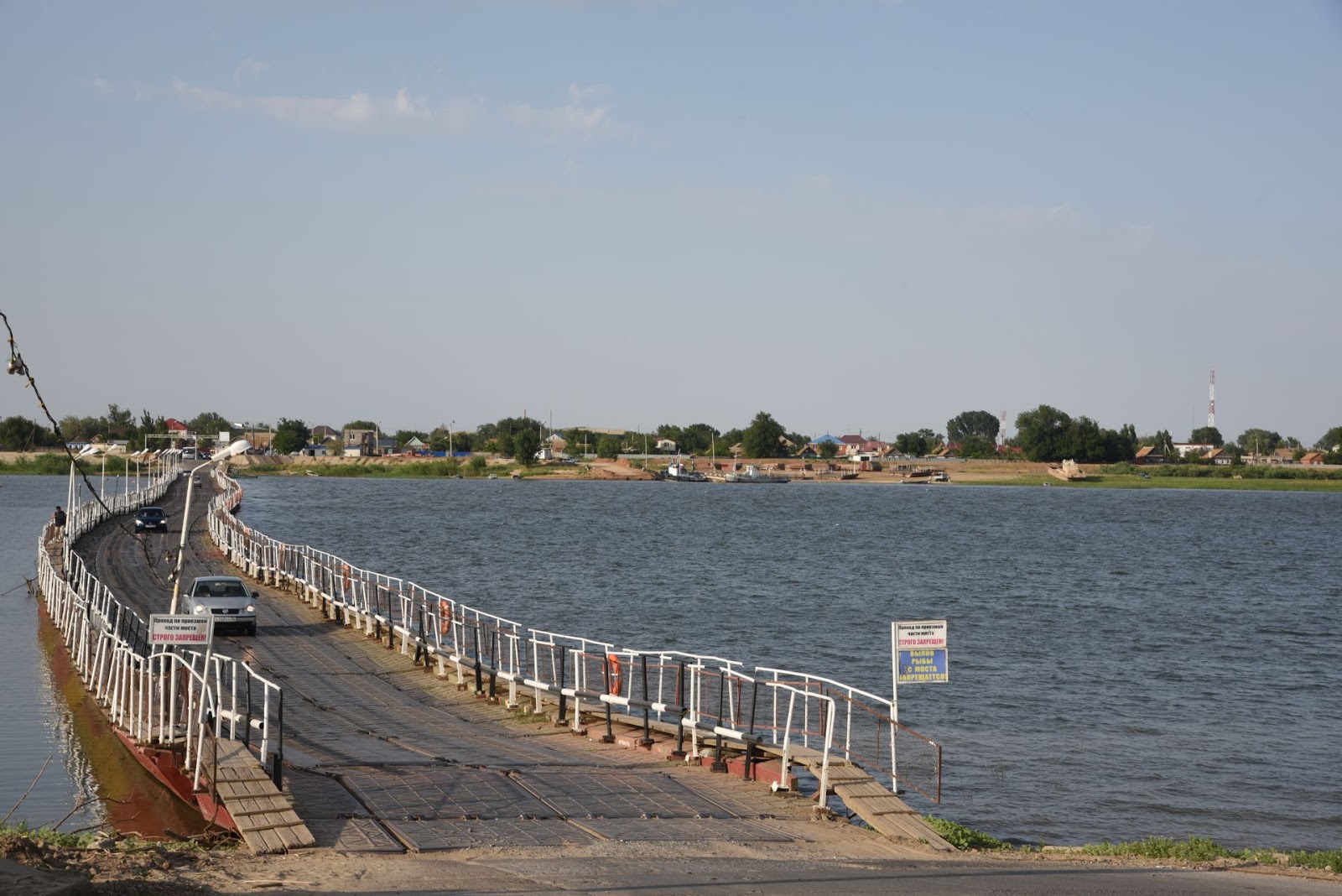 Hier der Grenzfluss, ein Nebenarm der Wolga: links Kasachstan, rechts Russland.