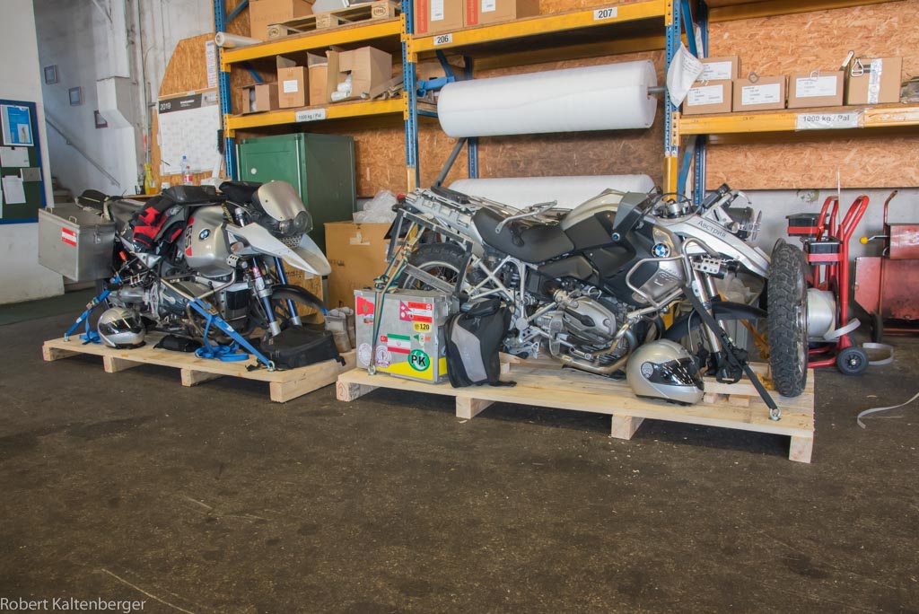 Unsere Motorräder haben wir vor gut 10 Tagen in Kisten verpackt. Hier auf der Grundplatte festgezurrt, Vorderräder, Windschilder, Spiegel und sonst alle weit vorstehende Teile abgebaut, um Volumen zu sparen.