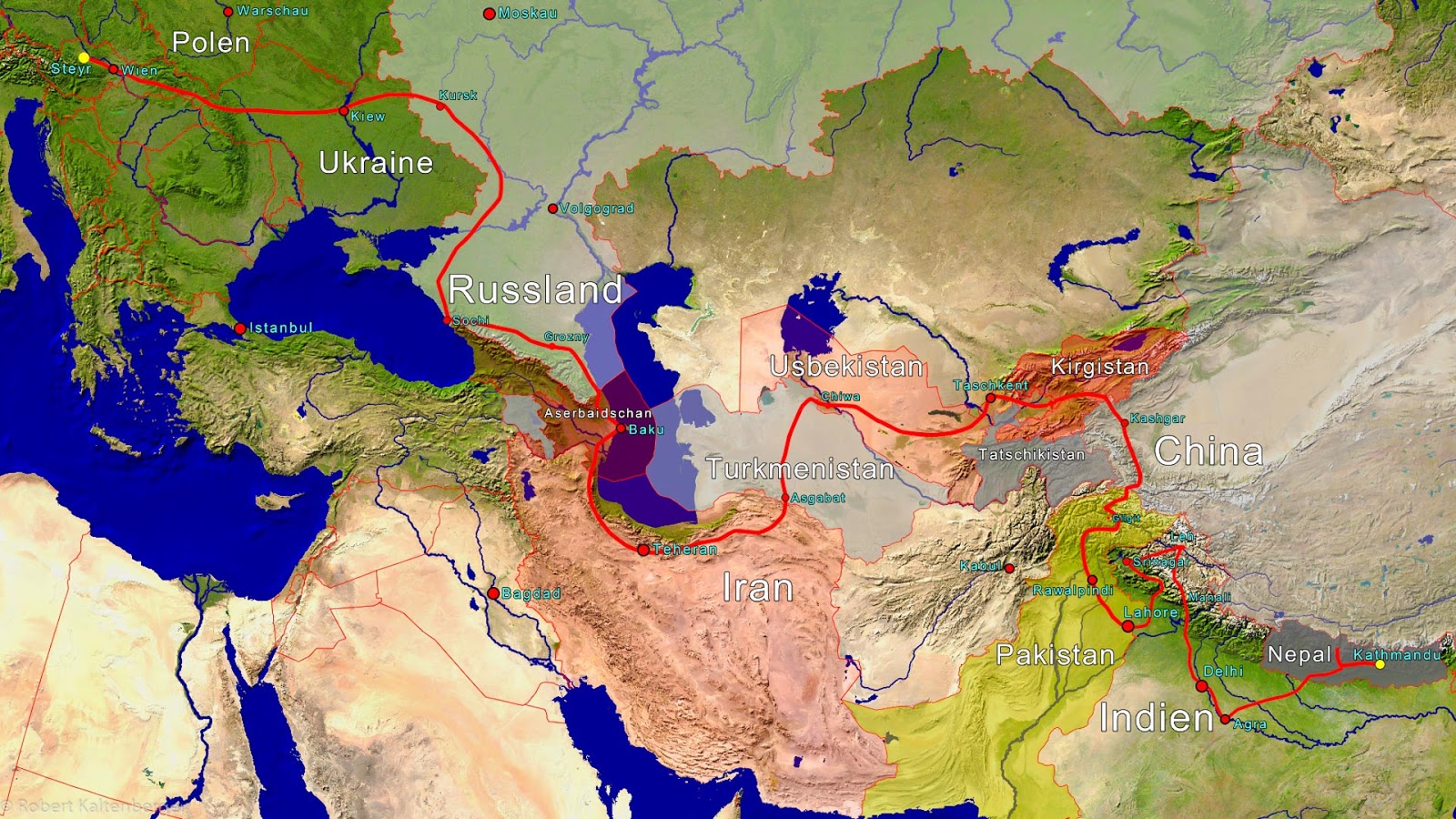 Also knapp 2 Monate Zeit für etwa 13 000 km.