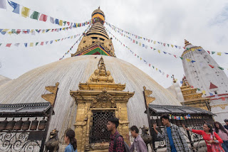 Der Swayambunath Tempel, oder auch Affentempel genannt, mit großer Stupa auf einem Hügel…