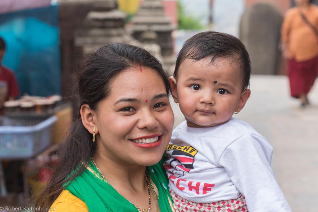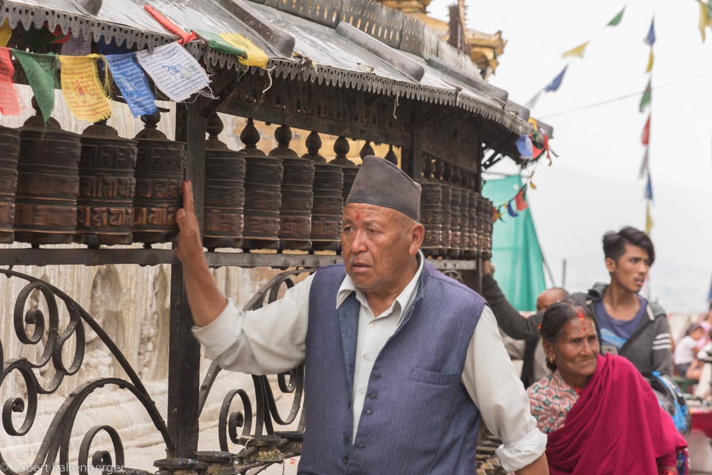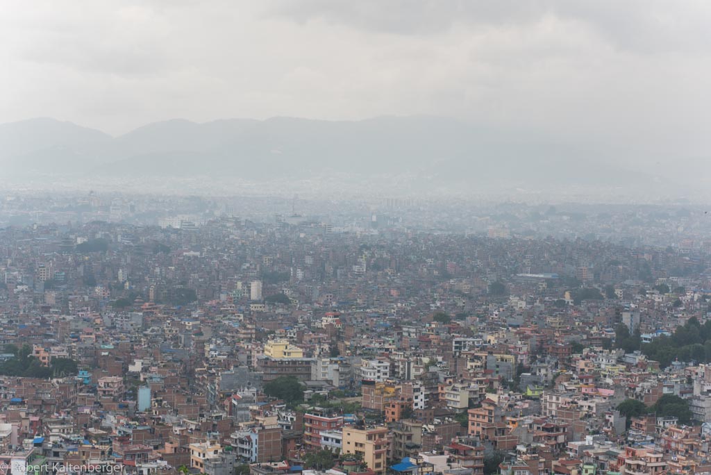Der Swayambunath Tempel, oder auch Affentempel genannt, mit großer Stupa auf einem Hügel…